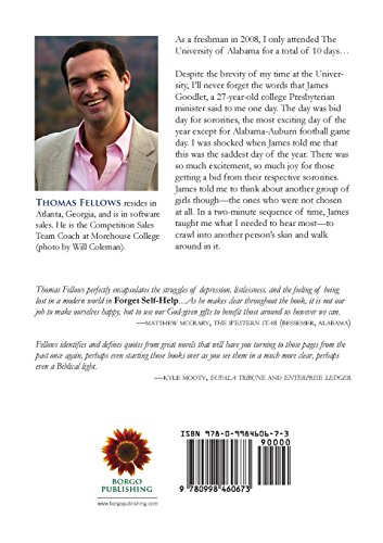 There is no book out there today like Forget Self-Help, by Thomas Fellows. Through his use of literature, history, psychology, scripture and personal experiences, Fellows stresses the importance of living out the Golden Rule of Matthew 7:12 to live a fulfilling, joyful life. While there has been a myriad of self-help books that have come out in the last decade, Fellows contends that the best way to help yourself is to help others. From his life experiences in the computer software sales world to his ongoing struggle with clinical depression, Fellows deftly encourages the reader to think of their troubles in a different light, a light that puts the emphasis on others instead of oneself.