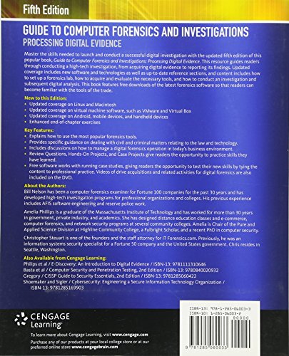 Updated with the latest advances from the field, GUIDE TO COMPUTER FORENSICS AND INVESTIGATIONS, Fifth Edition combines all-encompassing topic coverage, authoritative information from seasoned experts, and real-world applications to deliver the most comprehensive forensics resource available. This proven author team's wide ranging areas of expertise mirror the breadth of coverage provided in the book, which focuses on techniques and practices for gathering and analyzing evidence used to solve crimes involving computers. While other books offer more of an overview of the field, this hands-on learning text provides clear instruction on the tools and techniques of the trade, introducing readers to every step of the computer forensics investigation-from lab set-up to testifying in court. It also details step-by-step guidance on how to use current forensics software and provides free demo downloads. Appropriate for learners new to the field, it is also an excellent refresher and technology update for professionals in law enforcement, investigations, or computer security.Cengage Learning