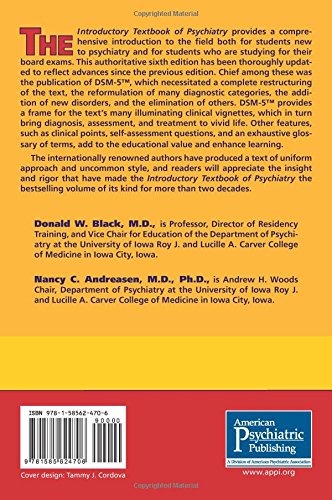 Thoroughly and scrupulously updated, the sixth edition of the Introductory Textbook of Psychiatry has been reorganized and rewritten to reflect the reformulated DSM-5(R) diagnostic classes, rendering all other texts obsolete. No other introductory psychiatry text incorporates up-to-date information on all of the major disorders, arranged by DSM-5(R) diagnostic class, along with current treatment information. Designed to provide medical students and beginning residents with a solid foundation and orientation to the field, the book has also been proven valuable to a variety of training programs, including advanced registered nurse practitioners, physician assistants, social workers, and psychologists. An abundance of useful features should win this new edition equal popularity and classic status: - The authors are accomplished writers as well as clinicians, and they have produced a volume that is consistent in style, very readable, and highly engaging. The redundancies sometimes encountered in a text with many authors have been avoided.- An exhaustively researched and scientifically rigorous section devoted to the neurobiology and genetics of mental illness has been included, because psychiatry is a scientific, as well as a clinical, discipline. - The detailed introduction to the psychiatric interview provides interviewing techniques, tips on taking the clinical history, and specific questions that may be asked to elicit information useful to diagnosis.- New medications have been released since the last edition, and more has been learned about existing drugs. All are addressed in detail here. - A host of reader-friendly features -- including interesting case vignettes, clinical points, chapter-by-chapter self-assessment questions, an up-to-date glossary of terms, and dozens of tables and figures -- promote learning and help the reader to gauge progress. Those studying for their board examinations will find them especially helpful. Grounded in the authors' long clinical experience and scholarly expertise, the Introductory Textbook of Psychiatry is a pedagogically sound and beautifully written text that is equal to the science and mystery of its subject. A new generation of medical students and residents will find it as interesting as it is indispensable.American Psychiatric Publishing